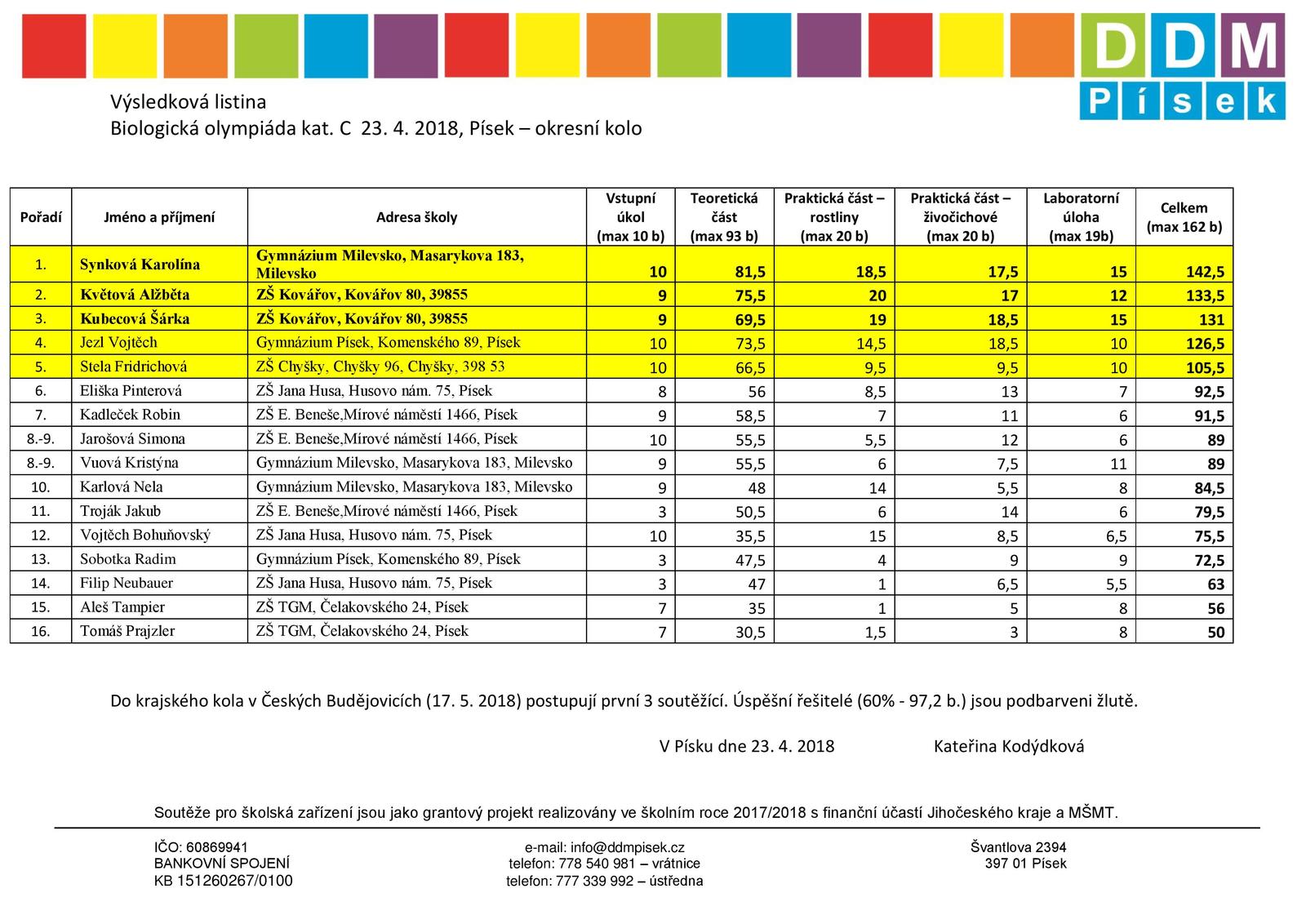 Z naší školy se do školního kola kategorie C zapojily tři žákyně primy a sekundy, které získaly dostatečný počet bodů pro postup do okresního kola konaného 23. 4. v Písku. Zde všechny žákyně přímo excelovaly. Nela Karlová (prima) se umístila na 10. místě, Kristýna Vuová (sekunda) na 8. – 9. místě a Karolína Synková (sekunda) na výborném 1. místě. Toto umístění zajistilo Karolíně postup do krajského kola.