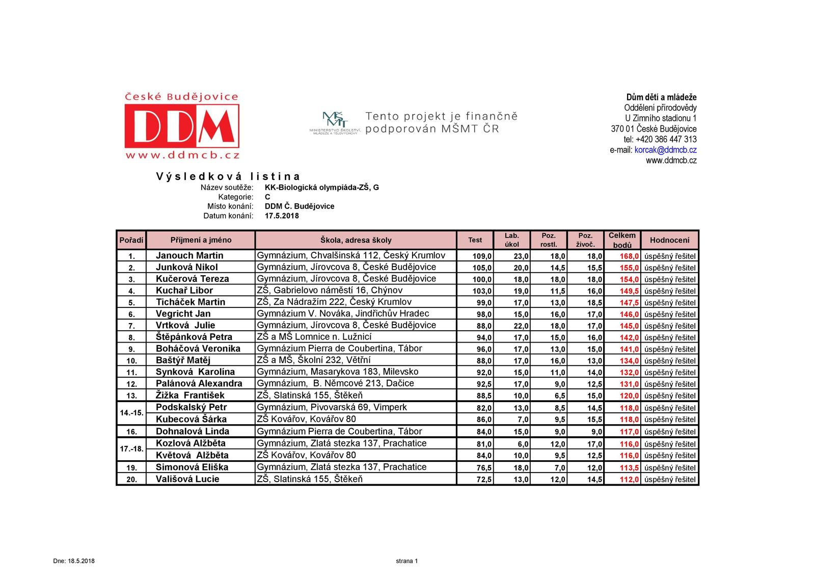 Ve čtvrtek 17. 5. se konalo krajské kolo BiO v Českých Budějovicích. V konkurenci nejlepších 20 žáků z celého Jihočeského kraje Karolína svými vědomostmi a dovednostmi vybojovala krásnou 11. příčku.