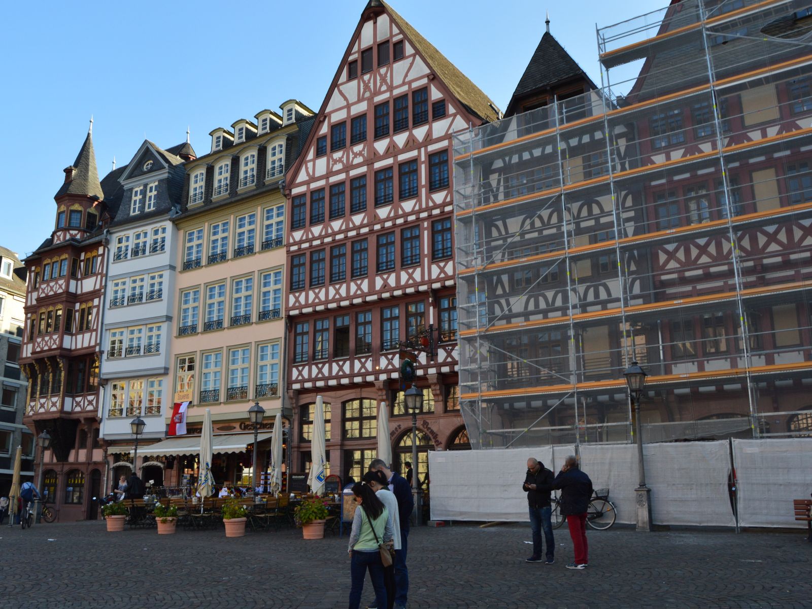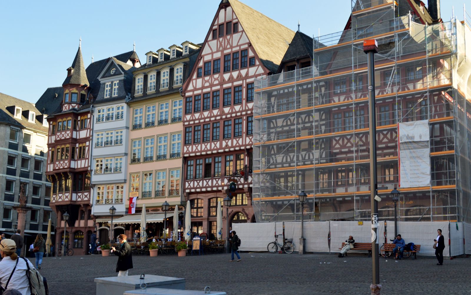 Foto: JŠ, wikimedia (znak euro před starou budovou ECB, nová budova ECB v noci a Goethehaus)