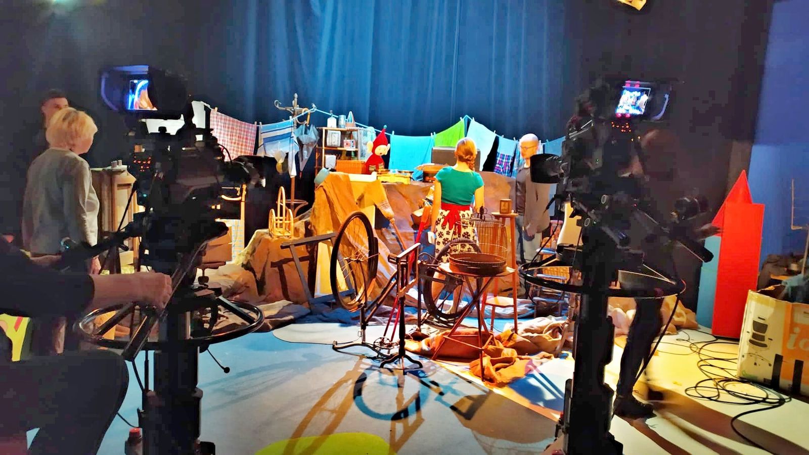 Václav Moravec s částí našich studentůVe 13 hodin žáci dorazili na Kavčí Hory, kde sídlí Česká televize a měli příležitost si projít studia a dílny, kde se natáčely známé seriály jako například Vyprávěj, či teď aktuálně seriál Božena.