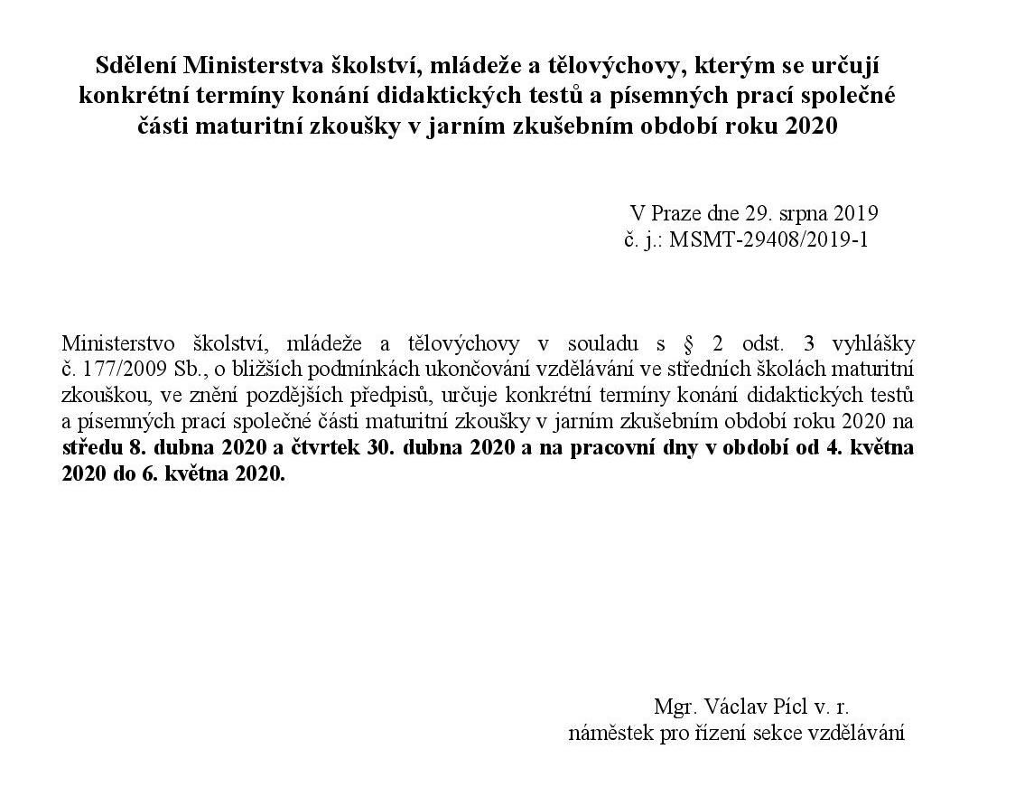 V jarním zkušebním období maturitní zkoušky 2020 se budou písemné zkoušky společné části konat ve středu 8. dubna 2020 a čtvrtek 30. dubna 2020 a v pracovních dnech v období od 4. května 2020 do 6. května 2020. Konkrétní termíny jednotlivých zkoušek (tzv. jednotné zkušební schéma) určí Ministerstvo školství, mládeže a tělovýchovy do 15. ledna 2020.