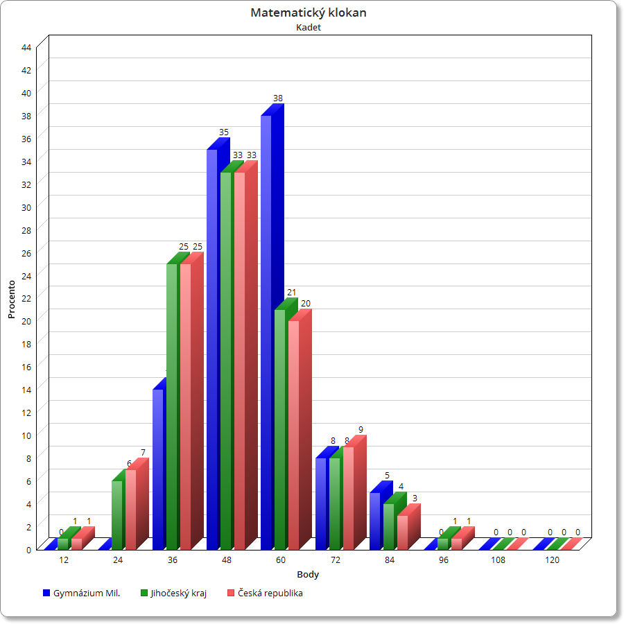 Logo soutěžeNaše třída kvarta v rámci projektu v předmětu Informatika připravila dále uvedené grafy. Z nich lze vyčíst, že nejlépe se dařilo našim nejmladším studentům, tedy Kadetu. Nejenže se dobře umístili v kraji, ale svými výsledky často i předčili republikový průměr. Studenti a Junioři většinou nijak nevynikli, avšak stále se drželi v dobrém průměru. Dle názoru našeho učitele výsledky naší školy odpovídají i podobným soutěžím (Přírodovědný klokan, Bobřík informatiky) ukazuje se, že studenti nižšího stupně jsou více soutěživí, zatímco starší studenti se už více specializují na určité předměty. Horší celkové průměry jsou způsobeny také tím, že na naší škole se píší tyto soutěže plošně (všichni žáci), zatímco zřejmě především v kategorii Student se účastní na jiných školách často jen zájemci, kteří pak dosahují v průměru lepších výsledků.