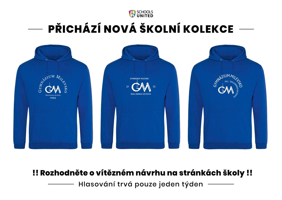 Při příležitosti 70. výročí naší školy přichází nová školní kolekce oblečení a jste to právě Vy, kdo rozhodne o její podobě! Hlasujte od 12.4 do 16.4.2023 o tom, který ze tří motivů se Vám líbí nejvíce. Vítězný motiv potom použijeme na vytvoření celé kolekce, kde najdete nejen mikiny a trička, ale i tepláky, batohy, čepice a další kousky.