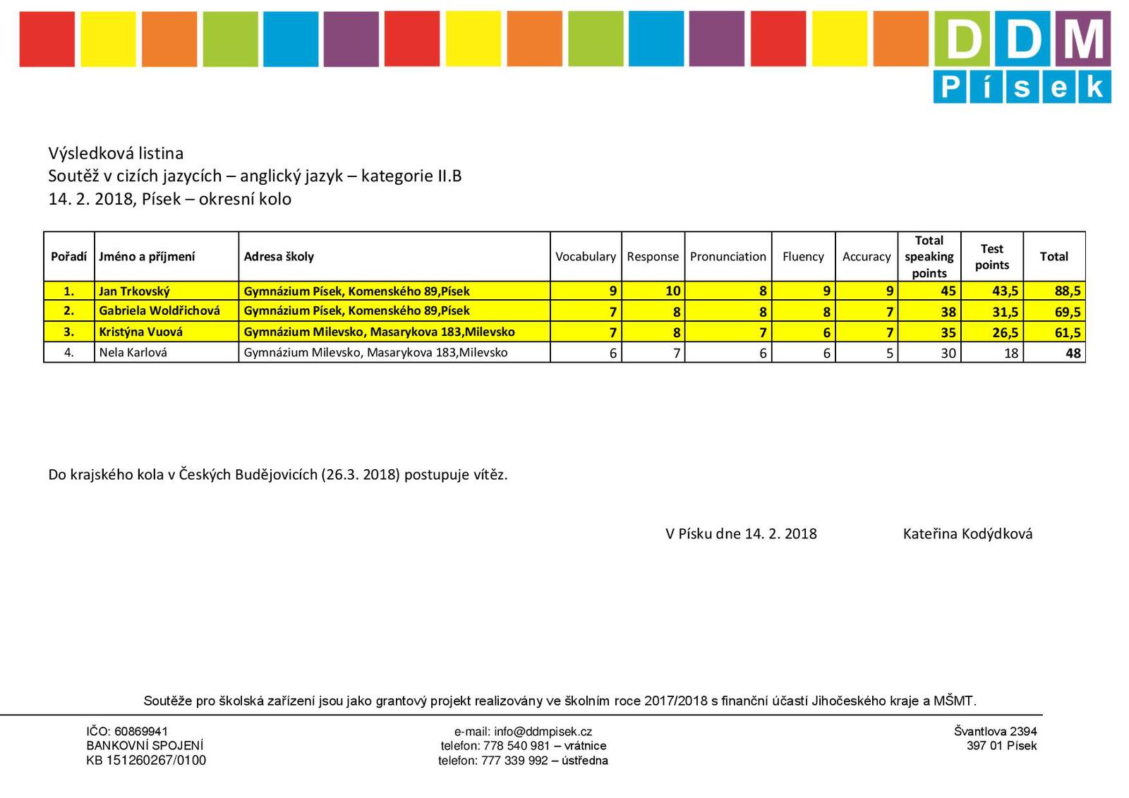 Ve středu 14. února soutěžili čtyři gymnazisté v kategorii II.B určené žákům tříd tercie či kvarta osmiletého (primy či sekundy šestiletého) gymnázia. Za Janem Trkovským a Gabrielou Woldřichovou z píseckého gymnázia skončila třetí naše soutěžící Kristýna Vuová ze sekundy. Další naše žákyně Nela Karlová z primy byla čtvrtá.
