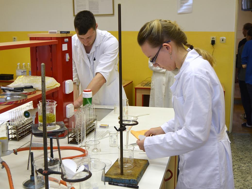 Maturanti si vylosovali stanoviště, kde se nacházely různé vzorky chemických látek. Nejprve provedli výpočty nezbytné pro další práci, poté se přesunuli do laboratoře. První pokusy měli určené, další postup již zvolili sami. Všichni v této části zkoušky velmi dobře uspěli. Začátkem května je čekají písemné zkoušky společné části, v polovině května zkoušky ústní.