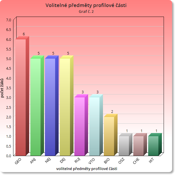 V profilové části si každý student volí právě dva předměty. Pokud se ve společné části rozhodl pro matematiku, musí si cizí jazyk zvolit v profilové části. Z cizího jazyka tak musí maturovat každý student. Graf č. 2: Volitelné předměty profilové části ilustruje zájem žáků o volitelné předměty. Z uvedeného grafu je zřejmý zájem (vedle angličtiny) především o německý jazyk, dějepis a geografii.