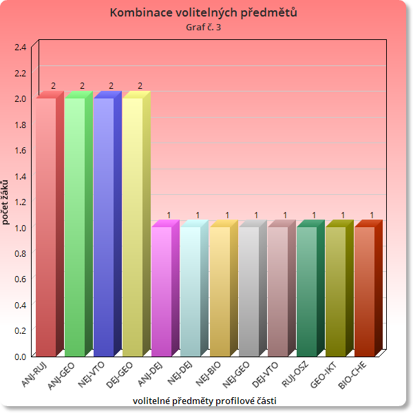Kombinace volitelných předmětů jsou různé, stejnou dvojici předmětů si zvolili maximálně dva žáci: viz graf č. 3: Kombinace volitelných předmětů.