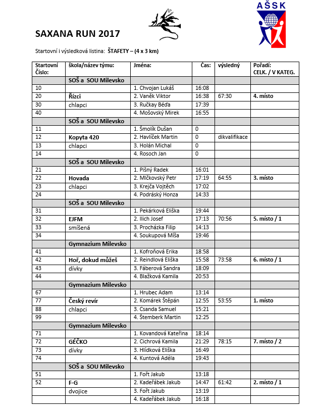 Štafeta Český revír ve složení Hrubec, Komárek, Csanda a Štemberk si doběhla pro přesvědčivé vítězství v čase 53:55. Špatně si nevedly ani naše dvě dívčí štafety - tým Hoř, dokud můžeš (Blažková, Reindlová, Fáberová a Kofroňová) se stal s časem 1:13:58 nejlepším dívčím týmem. Druhá běžecká skupina Géčko (Kovandová, Cichrová, Hlídková a Kuntová) měla trochu smůlu. Jedna ze závodnic se na trase ztratila, avšak i přesto podaly obdivuhodný výkon a doběhly hned za již zmíněným týmem Hoř, dokud můžeš v čase 1:18:15.