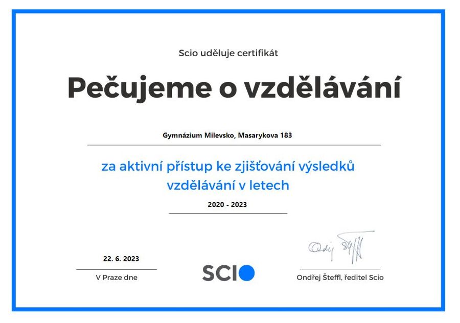 Od společnosti SCIO jsme obdrželi ocenění Pečujeme o vzdělávání.