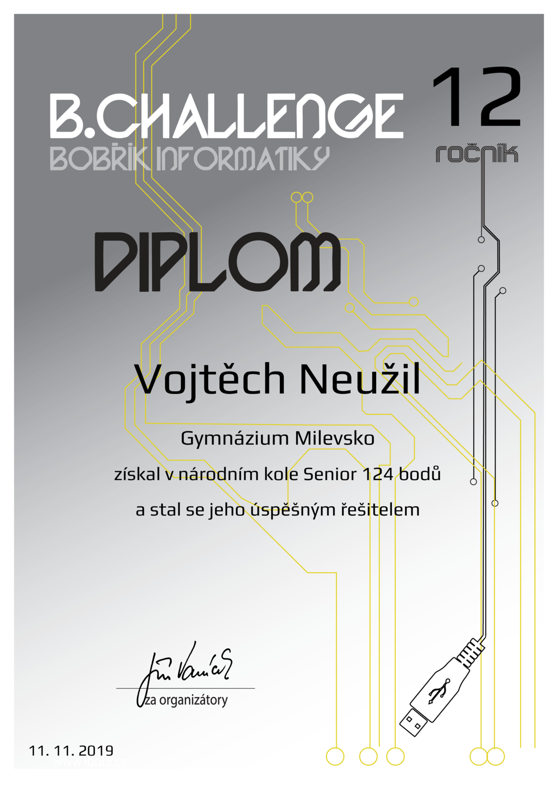 V pondělí 11. listopadu 2019 začalo u nás soutěžení nejstarší kategorií SENIOR. Do soutěže se mohli dobrovolně hlásit žáci tříd maturitního a předmaturitního ročníku. Největší zájem o soutěž byl v kvintě. Z kvinty se přihlásilo celkem 17 žáků, což jsou prakticky všichni žáci přítomni ve škole v den soutěže. Šest žáků se přihlásilo ze 3.A. Ze 4.A tři žáci. Škoda, že z třídy sexta se nikdo nepřihlásil, přitom v loňském ročníku byli žáci této třídy velmi úspěšní. Tři kvartáni v souladu s pravidly si vyzkoušeli soutěž ve vyšší než své kategorii.