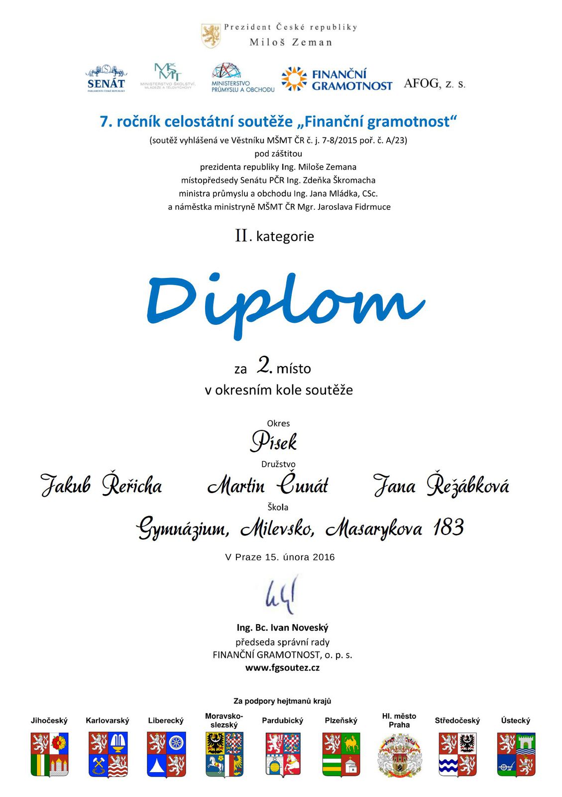 Náš tým pro III. kategorii postupuje do krajského kola, které proběhne stejnou formou jako kolo okresní v termínu do 31. března 2016. Nejlepší družstvo Jihočeského kraje postoupí do republikového finále, která se bude konat již prezenční formou. Všem našim jmenovaným studentům blahopřejeme k postupu do krajského kola a přejeme jim v něm hodně úspěchů.