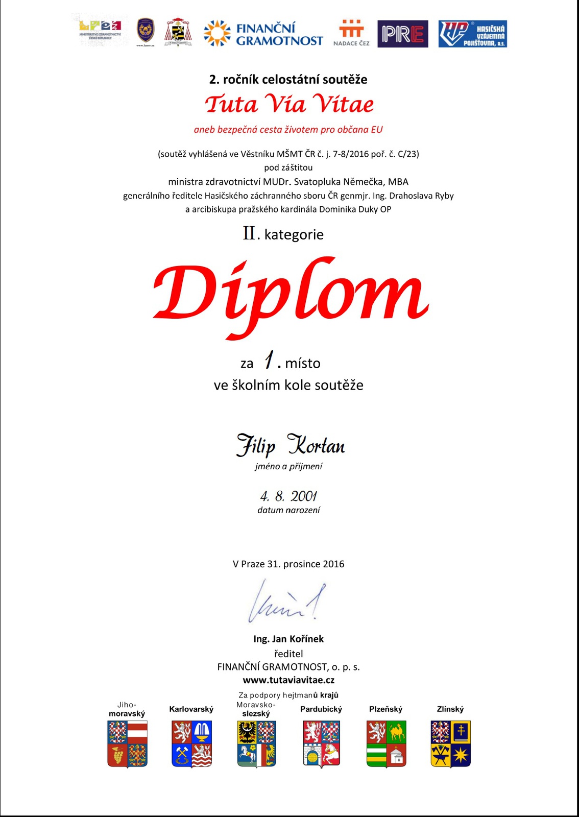 V podzimních měsících proběhlo školní kolo soutěže Tuta Via Vitae aneb Bezpečná cesta životem občana EU. Žáci a studenti vyplnili online test na webových stránkách tutaviavitae.cz. První tři v každé kategorii nyní utvoří družstvo, které bude reprezentovat školu v okresním kole. Další tři žáci či studenti jsou náhradníci.