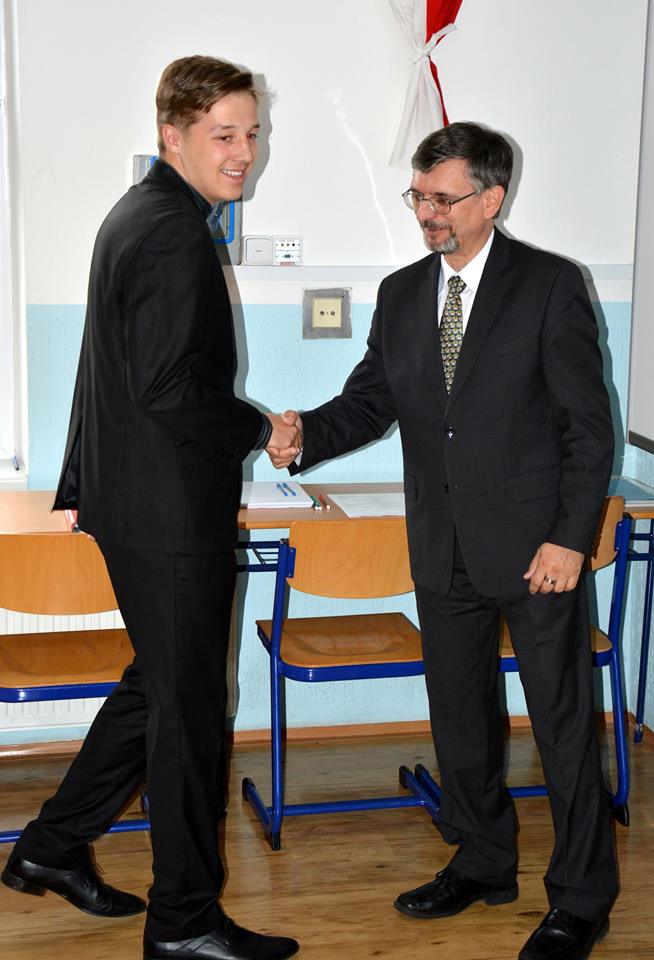 Maturanti při slavnostním zahájeníZástupci studentů přivítali předsedu maturitní komise 1Zástupci studentů přivítali předsedu maturitní komise 2Zástupci studentů přivítali předsedu maturitní komise 3Předseda maturitní komise a ředitel školyMaturantiMaturitní komise